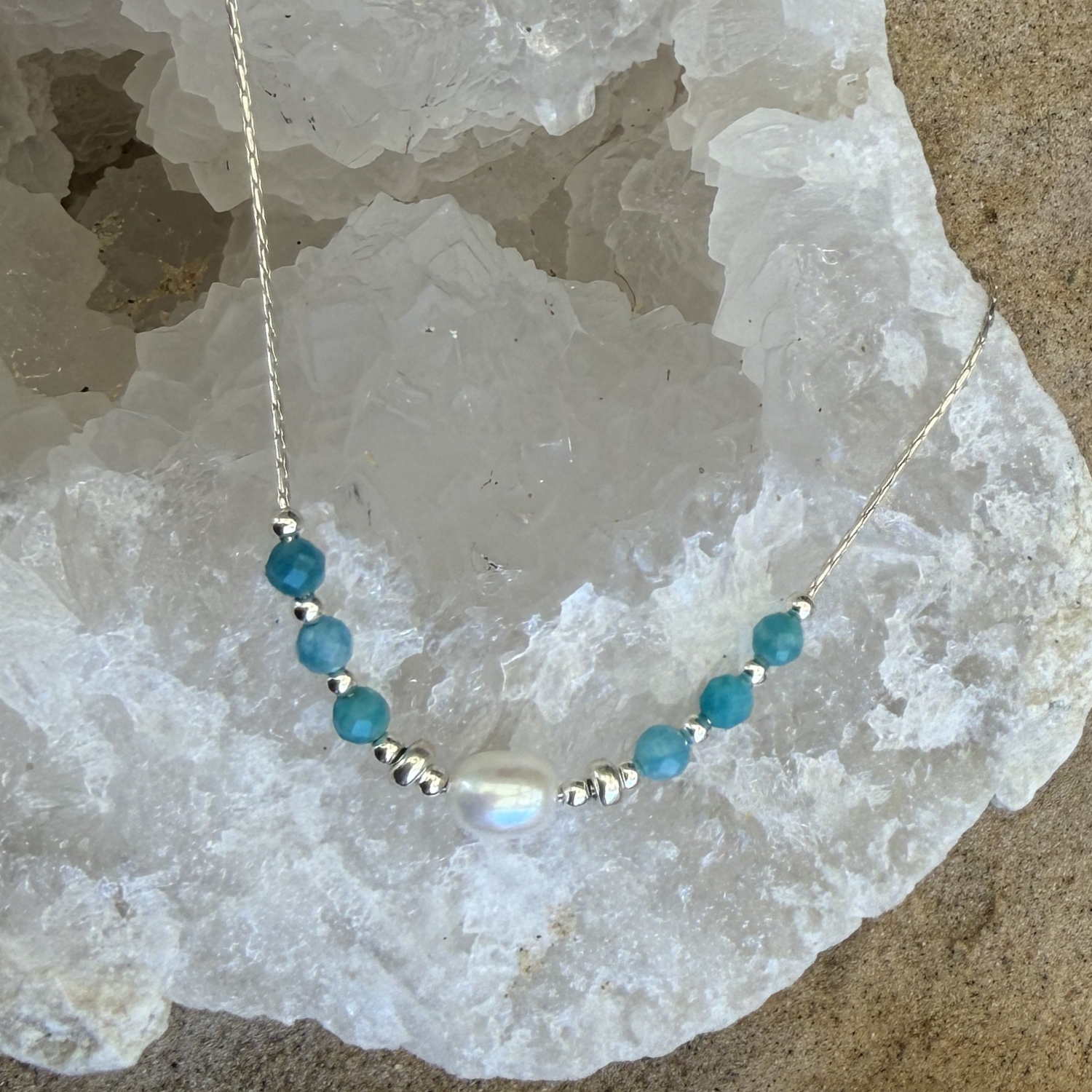 שרשרת כסף 925, עשויה מפנינה מרכזית ואבני חן אמזונייט.