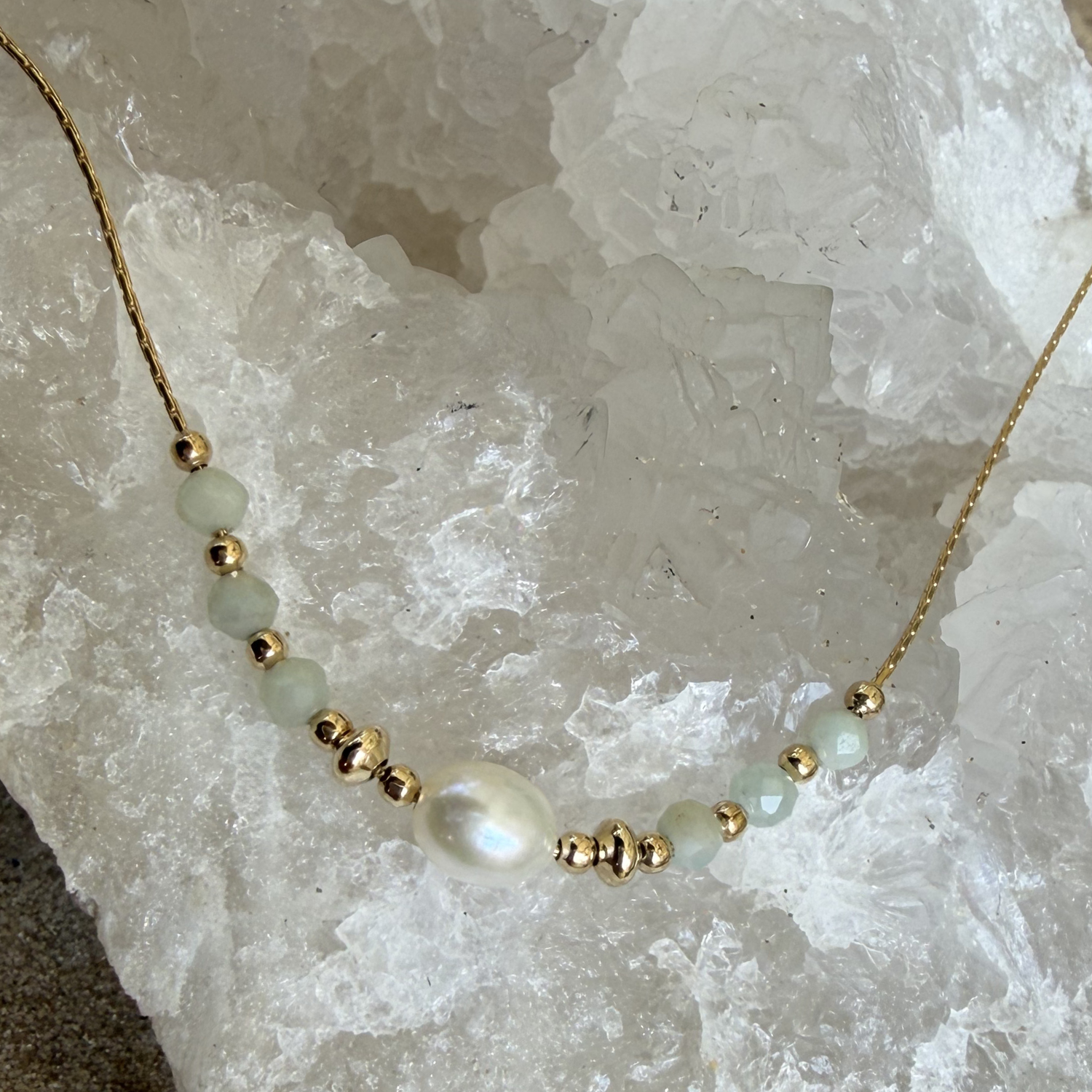 שרשרת גולדפילד עם פנינה מרכזית ואבני אקווה מרין עדינות.
